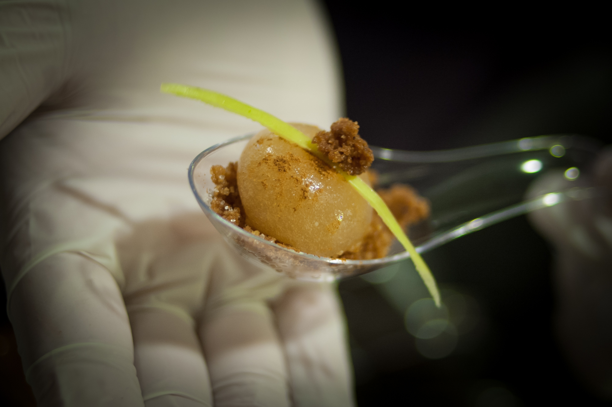 To serve, place the spherified apple in an Asian-style soup spoon and garnish with a bed of sugar and graham cracker crust crumbs, a sliver of green apple skin, and a dusting cinnamon.